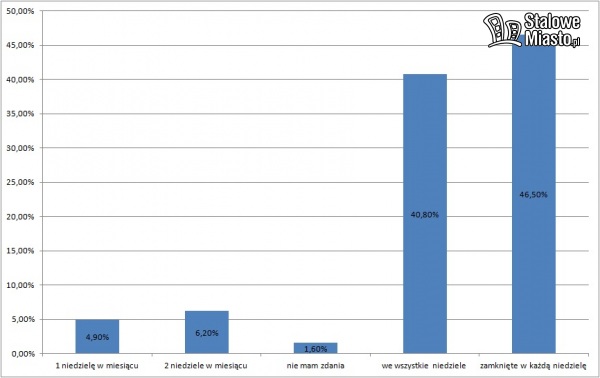 Jak wynika z przeprowadzonej przez nas sondy 46,5% internautów uważa, że sklepy powinny być zamknięte w każdą niedzielę. Przeciwnego zdania jest 40,8% respondentów, którzy są zdania, że nikt nie powinien im zamykać placówek handlowych w ten dzień. W opinii 6,2% głosujących sklepy powinny być otwarte 2 niedziele w miesiącu. 4,9% internautów uważa, że niedziela handlowa powinna odbywać się raz w miesiącu. 1,6% głosujących nie ma zdania na ten temat.
