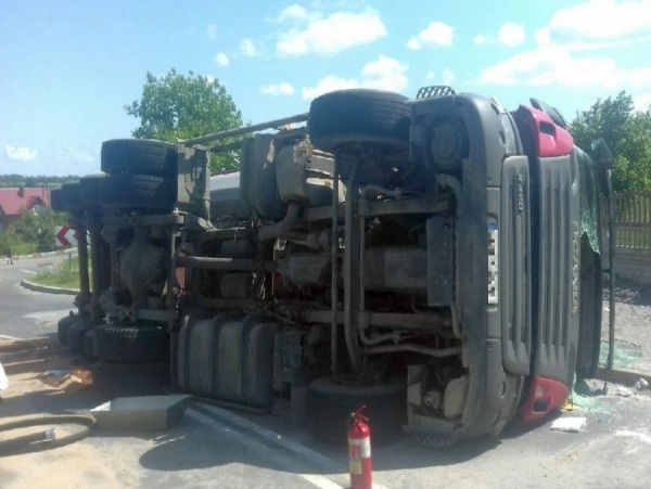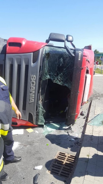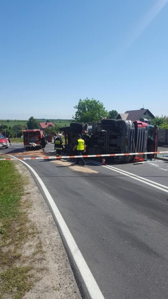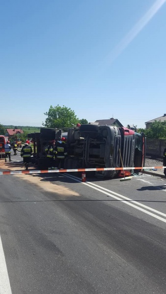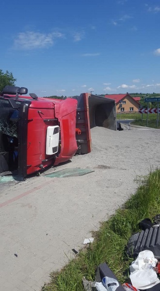 Do zdarzenia doszło tuż przed godziną 10.00 w Zdziechowicach Drugich w gminie Zaklików w ciągu drogi wojewódzkiej nr 855 relacji Stalowa Wola - Olbięcin. Scania przewożąca piasek przewróciła się na bok na łuku drogi. Na miejsce zdarzenia przybyli policjanci z KPP Stalowa Wola, strażacy z PSP Stalowa Wola i OSP Zaklików oraz karetka pogotowia. Stan poszkodowanego był na tyle poważny, że na miejsce wezwano Lotnicze Pogotowie Ratunkowe, które zabrało rannego mężczyznę do szpitala.