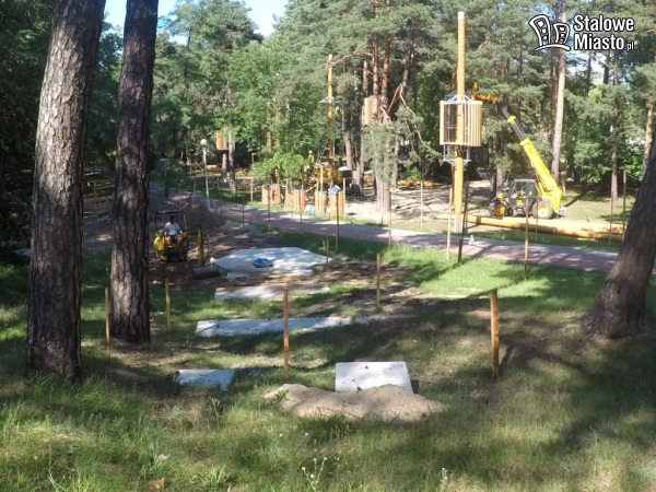 Deszczowy lipiec może pokrzyżować harmonogram prac prowadzonych przy budowie parku linowego.