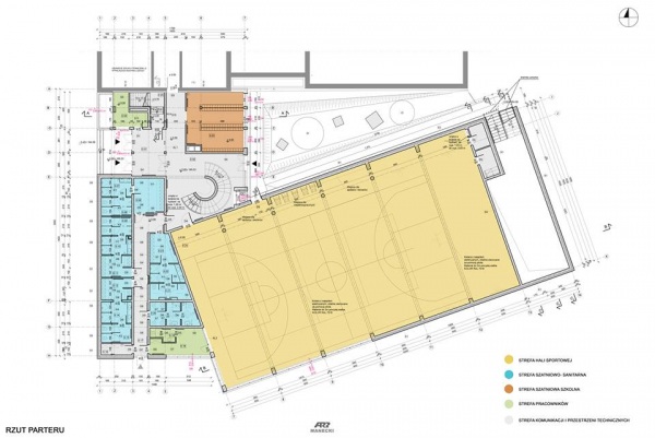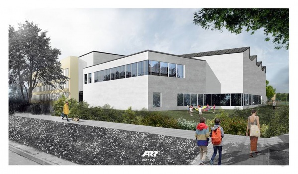 Budynek szkoły z salą gimnastyczną połączony zostanie przejściami na każdej kondygnacji (wejście bezpośrednio do strefy szatniowej). Na paterze będą znajdować się szatnie, sala sportowa i jej zaplecze. Na I piętrze wbudowane zostanie wejście na trybunę.