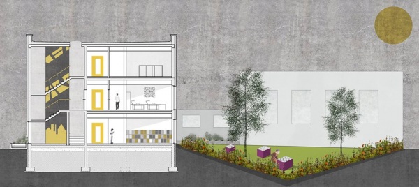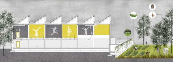 - W celu optymalnego doświetlenia hali sportowej najlepszym rozwiązaniem okazał się dach szedowy, bezpośrednio nawiązujący do wielkoprzemysłowych obiektów części Centralnego Okręgu Przemysłowego. Projektowane oraz istniejące bryły utworzyły cichy dziedziniec, na którym dzieci będą mogły spędzać przerwy oraz odbywać zajęcia lekcyjne w cieplejsze dni. Na jednej ze ścian przewidziano wykończenie z tynku pokrytego czarną farbą kredową, gdzie pojawi się motyw przewodni grafiki Centralnego Okręgu Przemysłowego. Ukazuje on "miasto w budowie" oddające postęp i nowoczesność kreującego się wówczas Miasta Stalowa Wola- mówi Lucjusz Nadbereżny.