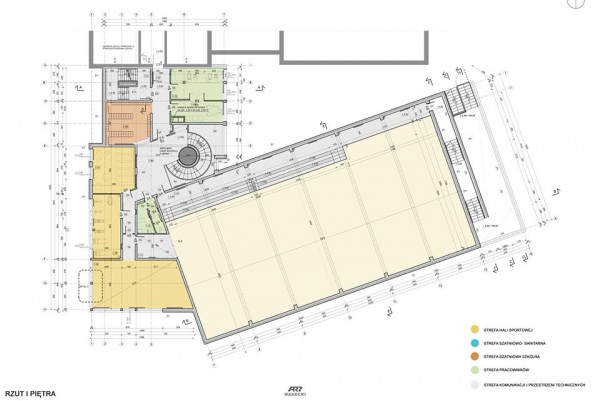 Również drugie piętro uzyska funkcjonalny podział: na strefę administracyjną (sekretariat oraz gabinet dyrekcji), strefę szatniową, szkolną oraz strefę sportową, gdzie znajdować się będą trzy sale: siłownia, sala do zajęć fitness oraz sala do zajęć korekcyjnych. Ostatnia kondygnacja mieścić będzie pomieszczenie wentylatorni oraz szatni szkolnej.