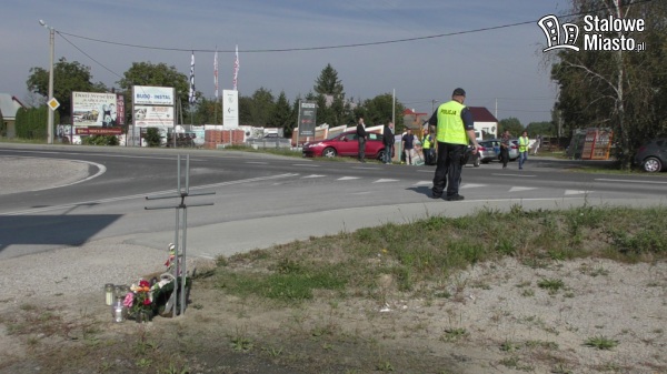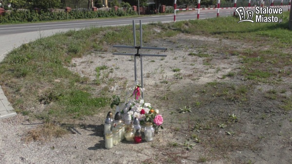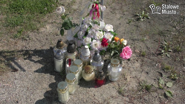Przy drodze ustawiono krzyż upamiętniający to wydarzenie. Przed nim płoną znicze.