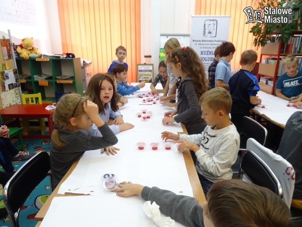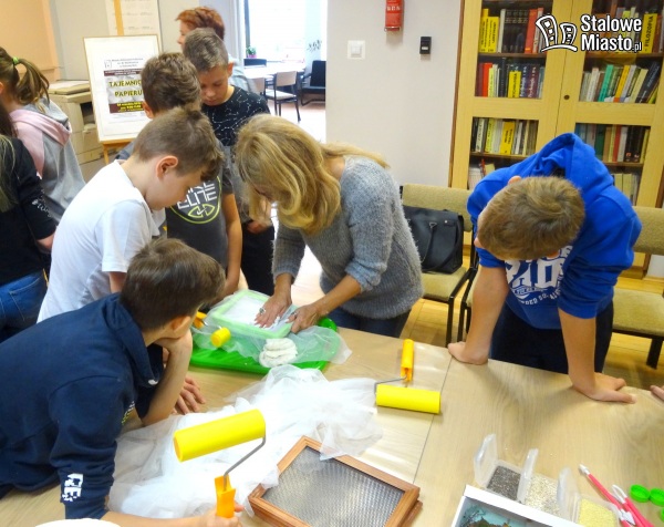 Kolebką papieru były Chiny, a jego pierwotny skład, to przede wszystkim jedwabne i lniane szmaty. Współcześnie stosuje się nowoczesne technologie wytwarzania papieru. Kolejnym krokiem były praktyczne warsztaty wytworzenia masy papierniczej i technika czerpania masy, aby powstał arkusz papieru. Dzieci brały czynny udział w przygotowaniu masy, a następnie za pomocą specjalnych ramek z sitem odsączały wodę z materiału papierniczego, wyrównywały jego powierzchnię i ozdabiały motywami roślinnymi (suszone liście, kwiaty, nasiona, różnorodne kasze). Efekt zaskoczył wszystkich, powstały własnoręcznie wytworzone i pięknie ozdobione arkusze papieru, które będą eksponowane na wystawie w Bibliotece Głównej 26 października w czasie podsumowania projektu „Kuźnia bibliolubnych” dofinansowanego ze środków Ministerstwa Kultury i Dziedzictwa Narodowego z Funduszu Promocji Kultury, pod honorowym patronatem Lucjusza Nadbereżnego Prezydenta Miasta Stalowej Woli.