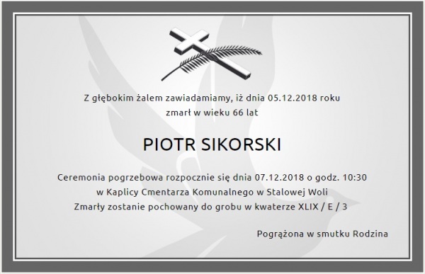 Piotr Sikorski zmagał się z chorobą nowotworową, ostatnie dni swojego życia spędził w szpitalu. Zmarł 5 grudnia w wieku 66 lat. Ceremonia pogrzebowa rozpocznie się 7 grudnia 2018 roku o godz. 10:30 w Kaplicy Cmentarza Komunalnego w Stalowej Woli.