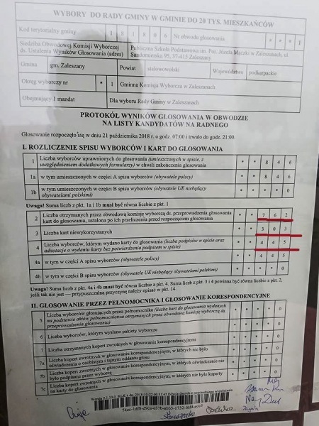 W przypadku Zaleszan, podczas głosowania, które miało miejsce 21 października 2018 roku, doszło do błędu przy wydawaniu kart. Z protokołu komisji wynikało, że przez pomyłkę komisja wydała 14 kart nieupoważnionym do tego osobom. Tym samym w głosowaniu wzięły udział osoby z innego Okręgu Wyborczego (Motycze Szlacheckie) co nie powinno mieć miejsca jako że z ich okręgu zgłosił się tylko jeden kandydat i w tym przypadku nie było konieczności dokonywania jakiegokolwiek wyboru. Sprawę zgłosił kandydat na radnego Mateusz Środek (Nowe Zaleszany), który przegrał zaledwie 2 głosami z Bogusławem Bąkiem z PiS. W tym przypadku 14 głosów mogło zmienić wynik wyborczy. O mandat powalczą obaj wspomniani kandydaci.