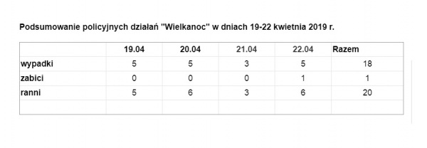 Jak co roku w trosce o bezpieczeństwo podróżujących, policjanci ruchu drogowego prowadzili wzmożone działania „Wielkanoc 2019”. W ciągu czterech dni działań, doszło do 18 wypadków, z czego 11 z udziałem jednośladów. W wyniku tych zdarzeń rannych zostało 20 osób, a 1 zginęła.