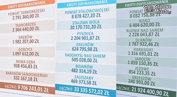 W przypadku powiatu stalowowolskiego środki pozyskają: powiat stalowowolski, Stalowa Wola, Pysznica, Zaklików, Bojanów, Zaleszany. Dofinansowanie dla naszego powiatu wyniesie w łącznie aż 33 335 572,02 zł.