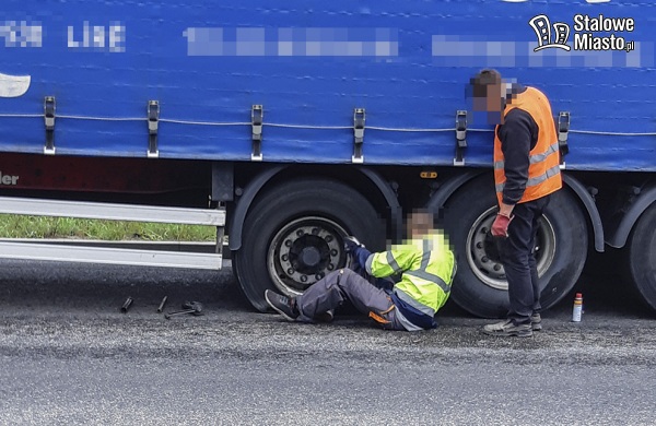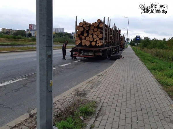 W trzech samochodach ciężarowych jadących jedną ulicą pękły nagle opony. Auta stanęły od siebie w niedużej odległości.