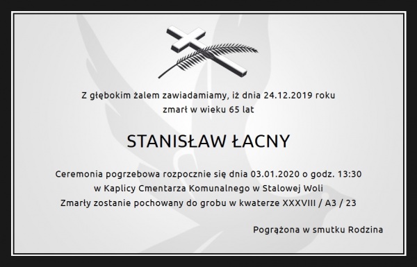 We wtorek 24 grudnia 2019 roku, w wieku 65 lat, odszedł do wieczności Stanisław Łacny, wieloletni pracownik Urzędu Miasta w Stalowej Woli.
