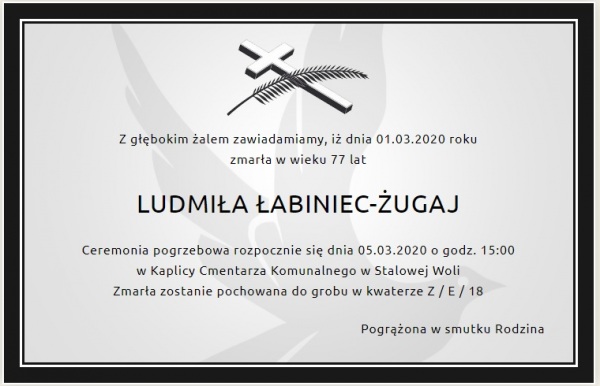 W czwartek 5 marca 2020 roku, na Cmentarzu Komunalnym w Stalowej Woli pochowana zostanie znana w naszym mieście lekarz psychiatra Ludmiła Łabiniec- Żugaj.