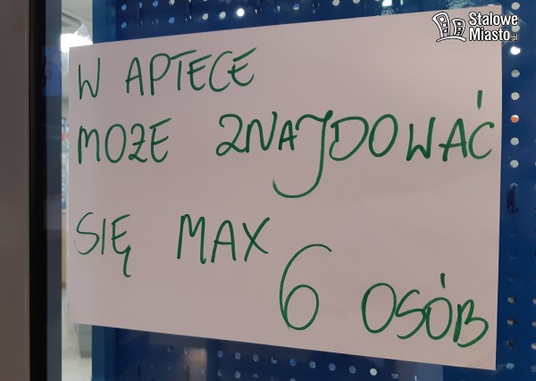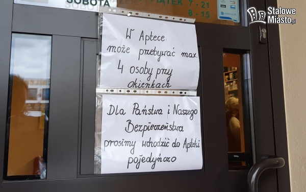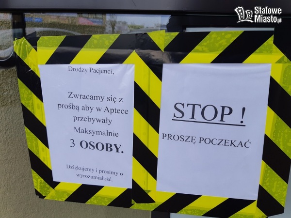 Na drzwiach wielu aptek w Stalowej Woli pojawiły się informacje z prośbą o wchodzeniu do środkach po maksymalnie 2-6 osób. Klienci stoją więc na zewnątrz czekając na swoją kolej. W jednej z aptek widzieliśmy prowizoryczną przestrzeń oddzielająca klienta od farmaceuty, zrobioną z taśmy budowlanej.