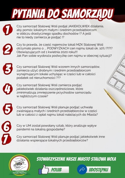 Zarówno radni Stalowowolskiego Porozumienia Samorządowego, jak i Stowarzyszenie NM wysłali do prezydenta Lucjusza Nadbereżnego prośbę o pomoc lokalnym przedsiębiorcom z powodu paraliżu wywołanego w Polsce koronawirusem. Stają zakłady pracy, wstrzymywana jest produkcja, do fryzjerów, kosmetyczek, dentystów nie chcą już chodzić ludzie, zamiera życie. Obserwując tendencję wzrostową zakażeń można przypuszczać, że walka będzie długa i trudna. Kto zdoła ją przetrwać? Wiele firm żyje od pierwszego do pierwszego, więc przestój kilkutygodniowy oznacza klęskę. Gdy pokonamy wirusa, możliwe, że nie będzie do czego wracać. Mieszkańcy zaczną szukać zatrudnienia poza granicami Stalowej Woli. Jak temu zapobiec?