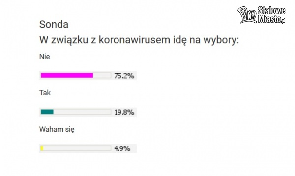 Aż 75,2% respondentów nie pójdzie do urn wyborczych. To pokazuje jak bardzo jesteśmy zdesperowani i jak mocno rozumiemy zagrożenie. 4,9% obywateli wciąż się waha. Zdecydowanych wejść do lokalu wyborczego i oddać głos jest 19,9% Czytelników. Mamy nadzieję, że jeśli dojdzie do wyborów zrobią to w maseczkach i rękawicach ochronnych.