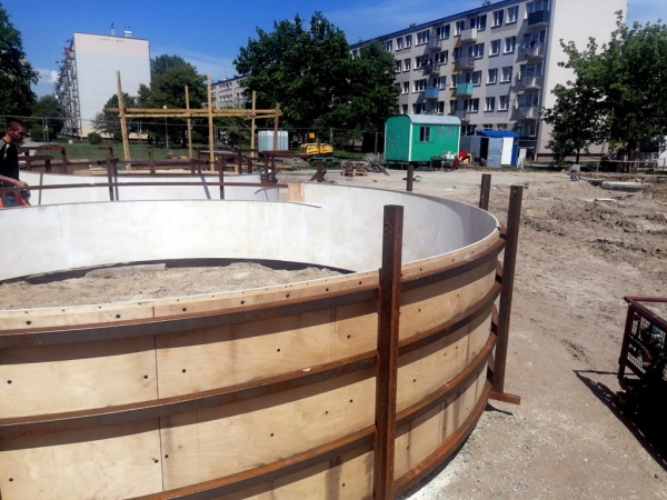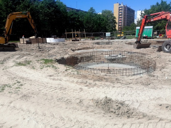 Prace ziemne i rozbiórkowe na terenie przy Alejach Jana Pawła II 6 wykonane są obecnie w około 50 %, a w około 60% roboty związane z kanalizacją sanitarną, deszczową i doprowadzeniem wody. Wykonane zostały przyłącza wodociągowe wraz ze studnią wodomierzową do fontann, kanalizacja deszczowa (bez drenażu), przyłącza kanalizacji sanitarnej, komora technologiczna pod automatykę fontann. Na chwilę obecną Wykonawca przygotowuje zbrojenie oraz szalunki ławek oraz fontanny. Trwają również ustalenia w sprawie technologii fontanny.