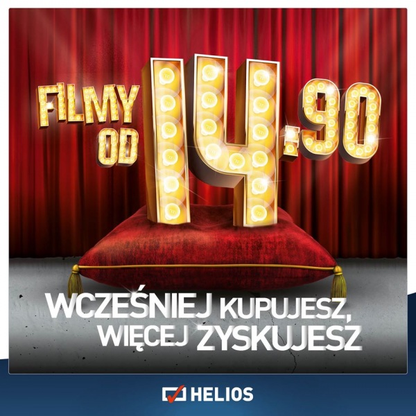 Helios rozpieszcza cenami miłośników dobrych filmów i fanów kinowej atmosfery. Poza znanym wcześniej Superwtorkiem, czyli wtorkowymi seansami w cenie 14,90 zł, czeka na widzów najnowsza oferta „Wcześniej kupujesz, więcej zyskujesz”, w ramach której najkorzystniejsze ceny biletów są dostępne na dzień lub co najmniej 3 dni (w zależności od kina) przed planowaną wizytą. To kinomani decydują, jaką kwotę chcą zaoszczędzić – kupując bilety wcześniej, oszczędzają więcej.