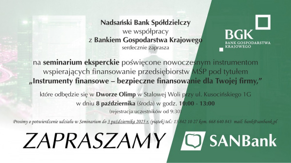 Już 8 października w Dworze Olimp w Stalowej Woli seminarium eksperckie z udziałem przedstawicieli Banku Gospodarstwa Krajowego i Nadsańskiego Banku Spółdzielczego.