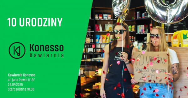 Świętujcie z nami już w najbliższą niedzielę. 28.09.2025 Kawiarnia Konesso al. Jana Pawła II 18f, Stalowa Wola, nie może Was zabraknąć. Szczegóły wydarzenia TUTAJ.