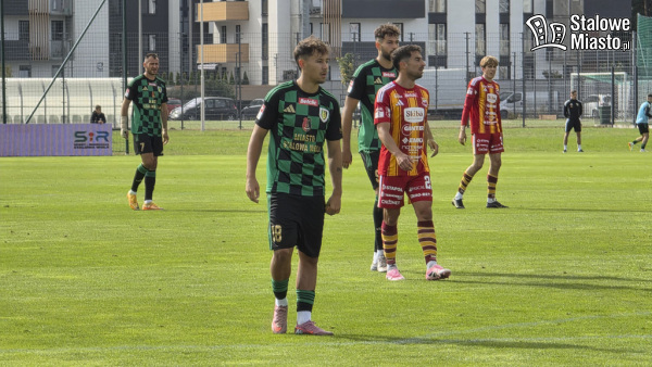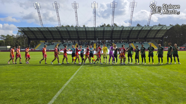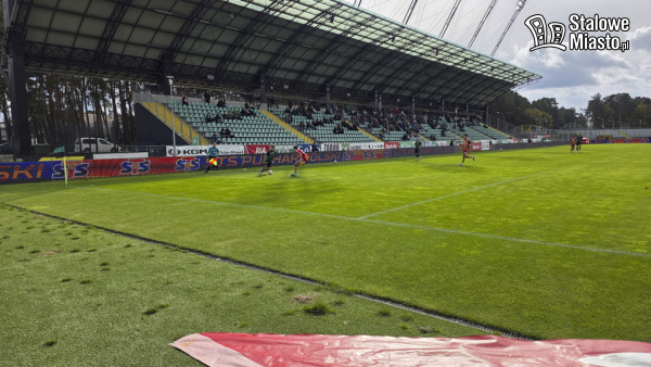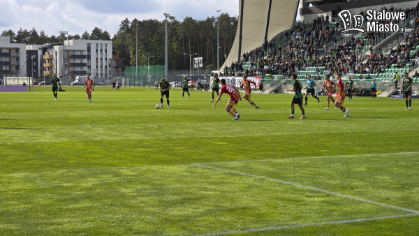 I połowa: rozpoczęła się niewykorzystanymi szansami Stalówki. Zielono- czarni wciąż atakowali pod bramką MKS, ale to w 19. minucie, po faulu na zawodniku gości i rzucie wolnym, Jakub Żywicki z Chojniczanki otworzył wynik meczu. Przegrywaliśmy 0:1. I takich sytuacji, kiedy mogliśmy stracić dużo więcej, było za chwilę kilka. Zauważyć można było brak koordynacji ze strony piłkarzy z hutniczego grodu, masę nieskutecznych podań i przejętych piłek przez Chojniczankę. W 32. minucie żółtą kartkę dostał Kukułowicz. W 36. minucie, po pięknej asyście Radecki- Hrnciar Dawid Łącki zdobył gola dla Stalówki. Zaczynaliśmy więc spotkanie od początku z nadzieją na więcej. Radość nie trwała zbyt długo, bo już 3 minuty później omal nie straciliśmy bramki. Chojniczanka znów atakowała.