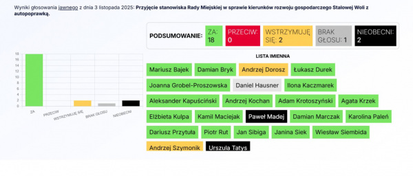 Prezydent Lucjusz Nadbereżny, wspólnie z radnymi Rady Miejskiej w Stalowej Woli, wypracował wspólne stanowisko, które zostało przyjęte bez głosu sprzeciwu: 18 radnych opowiedziało się „za”, 2 wstrzymało się od głosu, jeden radny nie oddał głosu, a 2 było nieobecnych. To wyraz jedności i odpowiedzialności samorządu wobec kluczowych decyzji dotyczących rozwoju gospodarczego i przestrzennego miasta.