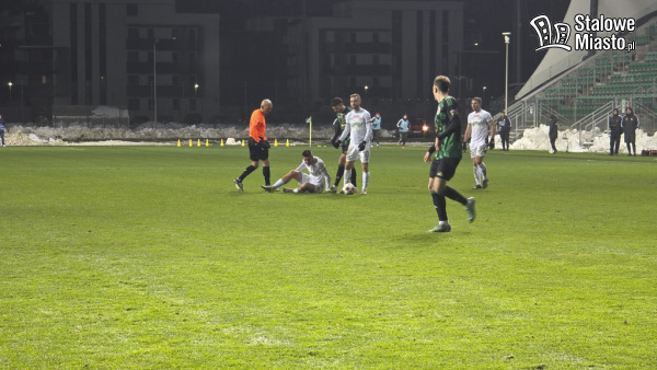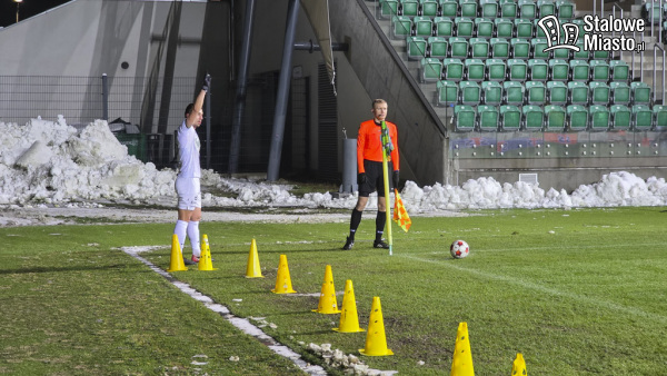 I połowa: rozpoczęła się od ataków na obie bramki. Było zimno i prószył śnieg. Kibice Stalówki mocno dopingowali zielono- czarnych zawodników. Po kilku minutach gra na jakiś czas przeniosła się pod pole karne Stali. Na szczęście nie na długo. W 21. minucie Patryk Zaucha miał doskonałą szansę na otwarcie wyniku meczu, niestety, piłka minęła jedynie słupek. Niemniej jednak akcja była piękna. Rywale często faulowali. Piłkarze z Hutniczej wciąż leżeli na murawie. Żółtek kartki sędzia jednak nie pokazał ani jednej. W 25. minucie Kędzia nie wyłapał piłki po podaniu Kukułowicza i zmarnował okazję na bramkę, mimo, że stał tuż przy lewym słupku. Szczęście uśmiechnęło się do nas po raz pierwszy w 35. minucie Zaucha zdobył gola dla Stali. Stało się to po błędzie bramkarza Olimpii, który wychodząc z bramki pośliznął się i upadł na murawę. Poza polem karnym próbował też złapać futbolówkę w ręce, ale sędzia nie zareagował. Piłkę za to przejął nasz zawodnik i spokojnie podszedł pod samą siatkę i wprowadził lekko futbolówkę gdzie trzeba. Wygrywaliśmy 1:0. Stalówka broniła się jak trzeba, a stałe fragmenty gry nie wychodziły dobrze drużynie gości. Mecz mógł się podobać ze względu na dynamikę i zaangażowanie obu drużyn. Do I połowy doliczono 1 minutę. Nic się już nie wydarzyło, a z boiska piłkarze schodzili z wynikiem 1:0 dla Stalówki.