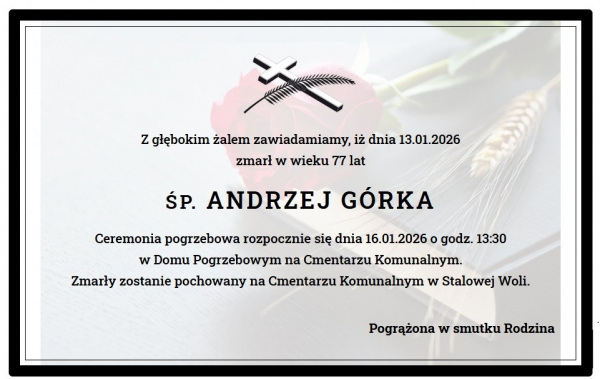 Andrzej Górka zmarł 13 stycznia 2026 roku. Zostanie pochowany na Cmentarzu Komunalnym w Stalowej Woli 16 styczna br. Ceremonia pogrzebowa rozpocznie się o godzinie 13:30.