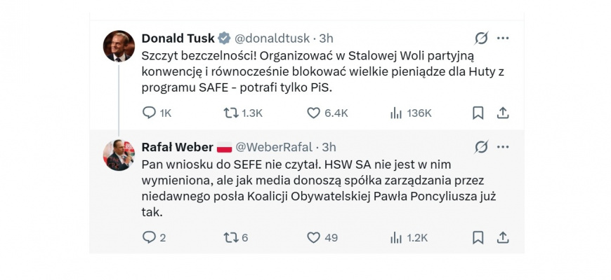 - Pan wniosku do SAFE nie czytał. HSW SA nie jest w nim wymieniona, ale jak media donoszą spółka zarządzana przez niedawnego posła Koalicji Obywatelskiej Pawła Poncyliusza już tak- pisze na X Rafał Weber.