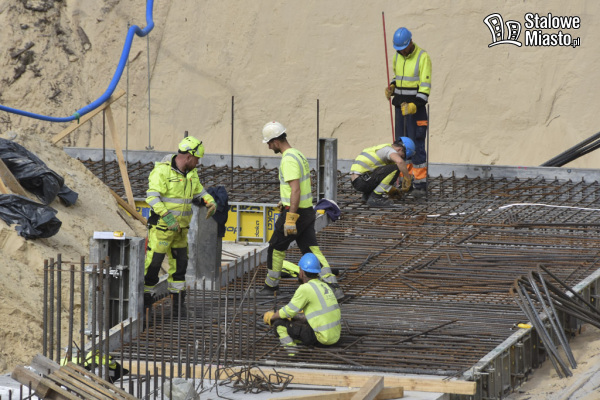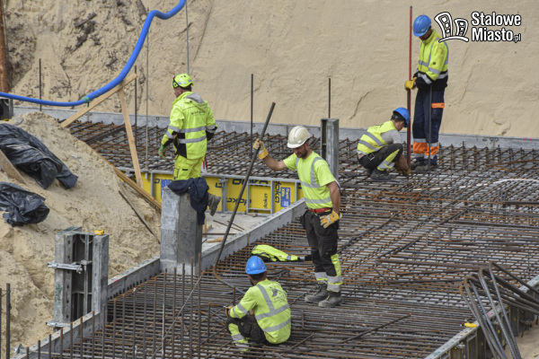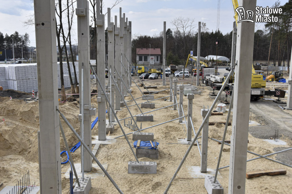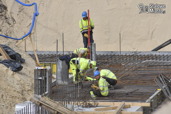 Już wkrótce przestrzeń pomiędzy słupami żelbetowymi, konstrukcyjnymi zostanie wypełniona prefabrykowanymi ścianami oporowymi, a obiekt w kolejnych tygodniach będzie stopniowo „zamykał się” od strony łącznika do obwodnicy oraz od parkingu i ulicy Energetyków. W tych strefach zaplanowano elementy szklano- aluminiowe, które będą pełniły funkcję wejściową i komercyjną, nadając budynkowi estetyczny, reprezentacyjny charakter.