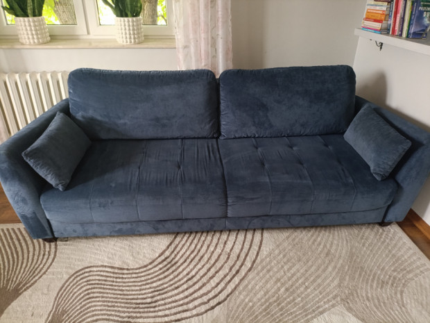 Sprzedam kanapę w kolorze granatu, z funkcją spania, pojemnikiem na pościel. Kanapa jest w bardzo dobrym stanie, materiał jest wytrzymały i odporny na wszelkiego rodzaju zabrudzenia czy wytarcia. Wymiary 230x99, powierzchnia spania 200x140.