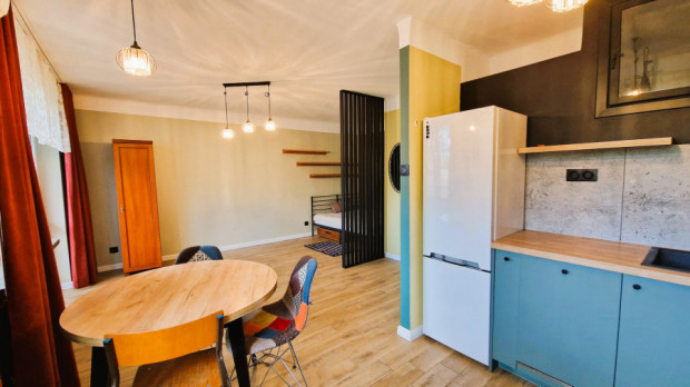 Rozkład: Przestrzeń dzieli się na jasny salon z wydzieloną częścią sypialnianą, z aneksem kuchennym oraz funkcjonalną łazienkę. Dzięki przemyślanemu rozmieszczeniu mebli mieszkanie sprawia wrażenie większego, niż wskazują metr,