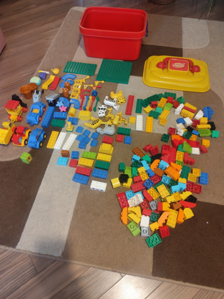 Klocki Lego duplo + smily play (identyczne) polskiej firmy. Około 230 szt. W solidnym pudełku. Kontakt SMS.