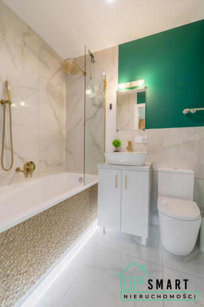 W łazience znajduje się wanna z przeszkloną osłoną prysznicową, toaleta oraz szafka z umywalką. Stylu dodają baterie wykończone w kolorze złota oraz płytki na wysoki połysk z marmurowym wzorem, co tworzy elegancki i nowoczesny charakter wnętrza.