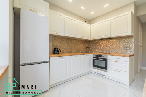 Kuchnia jest oddzielna, przestronna i utrzymana w jasnej kolorystyce. Zabudowa meblowa w kolorze białym nadaje wnętrzu lekkości, a uroku dodaje wykończenie ściany za meblami – strukturalne płytki w odcieniu złota, które pięknie komponują się z całością.