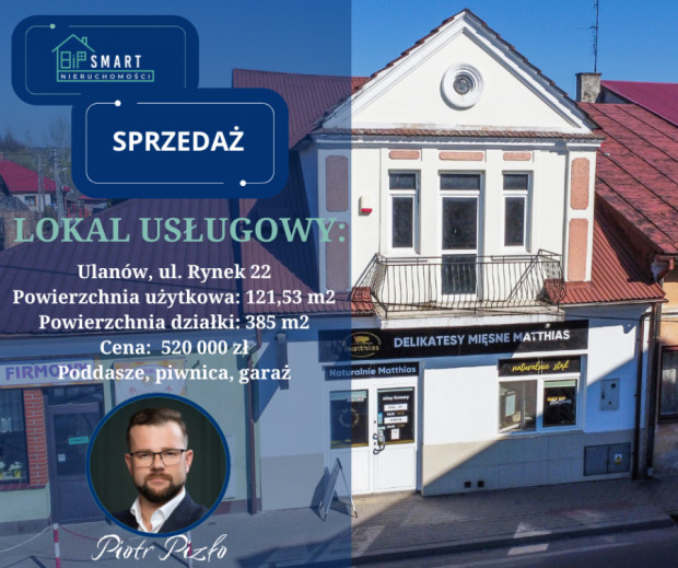 Biuro BiP Smart Nieruchomości prezentuje unikatową ofertę sprzedaży budynku usługowo-handlowego o powierzchni 121,53 m², zlokalizowanego w ścisłym centrum Ulanowa, bezpośrednio przy Rynku – w jednej z najlepiej wyeksponowanych lokalizacji w mieście.