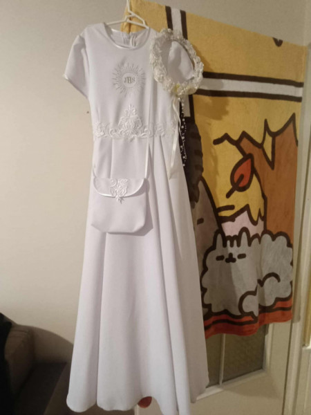 Sprzedam sukienkę komunijną,w zestawie jest torebka,wianek oraz buty rozmiar 36.Cena za cały zestaw 200 zł,ewentualnie jeżeli ktoś chce bez butów to cena 170 zł.