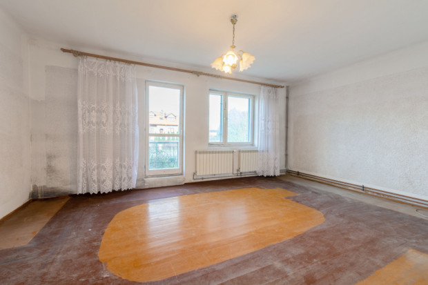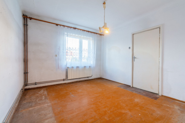 Parter stanowi starszą część domu i wymaga większych nakładów modernizacyjnych. Na podłogach znajdują się drewniane deski oraz wykładzina PCV, w korytarzu ściany i sufit wykończone są boazerią.