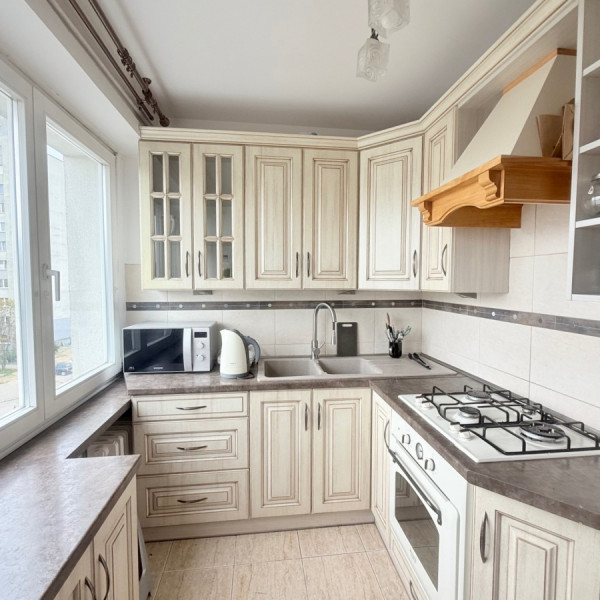 W bardzo dobrym stanie technicznym jest kuchnia. W kuchni na podłodze są ładne płytki, jasno beżowe meble robione na wymiar na zawiasach Blum. Pomieszczenie przestronne, ustawne mieści się sporo mebli , stół i duża lodówka.