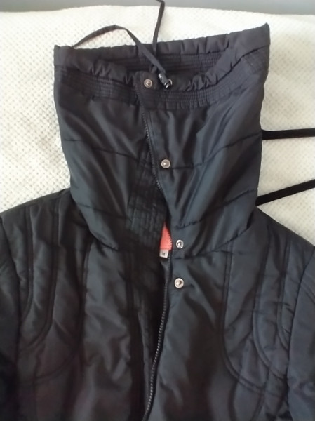 Kurtka ma długość 63 cm. Jest czarna i ciepła. Rozmiar M.