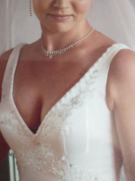 Suknia jest w rozmiarze S, na osobę o wzroście 168 cm+ 2-4 cm obcas. Skład materiału jedwab i satyna. Ozdobiona perełkami, srebrnymi cekinami i białym haftem. Z tyłu zamek. Talia ok. 66cm, biust ok. 82cm. Halka i welon gratis
