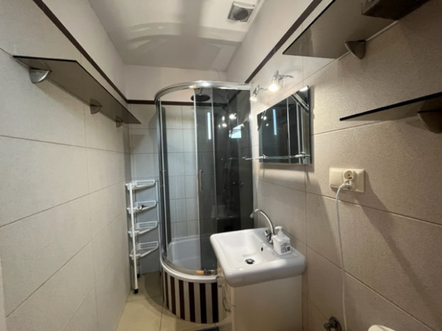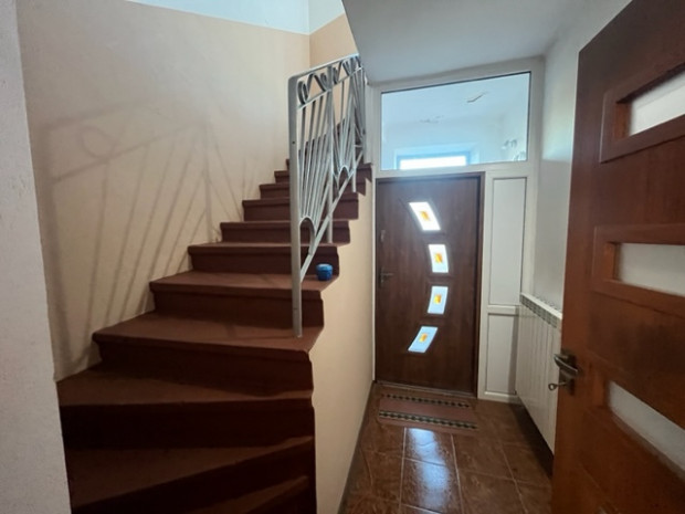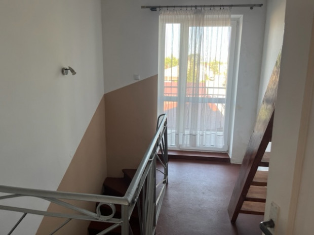 Łazienka – 4 m 2 z oknem i kabiną prysznicową. Klatka schodowa z betonowymi schodami prowadzącymi na piętro budynku i sień