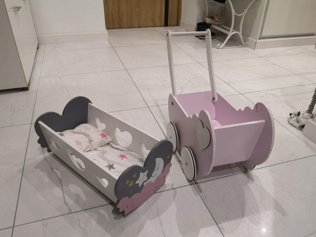 Wózek dla lalek w zestawie w raz z drewnianym łóżeczkiem/kołyską dla lalek z dołączoną poduszką i kocykiem.