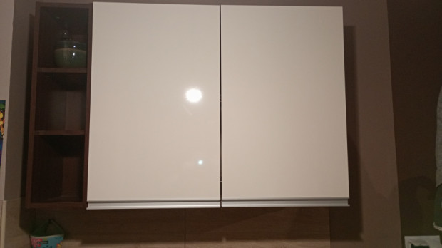 kolor frontów biały połysk ze srebrnymi uchwytami , boki kolor czekolada.