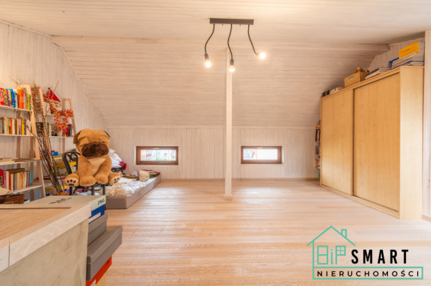 Jasne, wykończone naturalną drewnianą lamperią poddasze to prawdziwa perła tego domu. To może być Twój domowy gabinet, pracownia artystyczna, sala zabaw dla dzieci, strefa fitness, biblioteka czy cokolwiek, czego potrzebuje Twój styl życia. Wysokie skośne sufity i naturalne drewno tworzą wyjątkowy, skandynawski klimat.