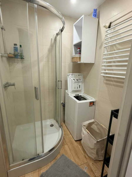 łazienki z prysznicem i pralką.