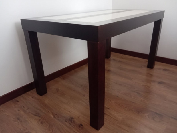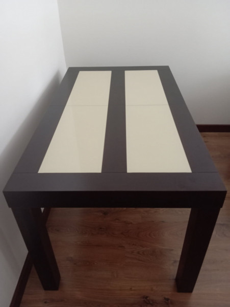 Wymiary stołu: 140 cm x 80 cm, wysokość 75.5 cm + wkładka o szerokości 40 cm.