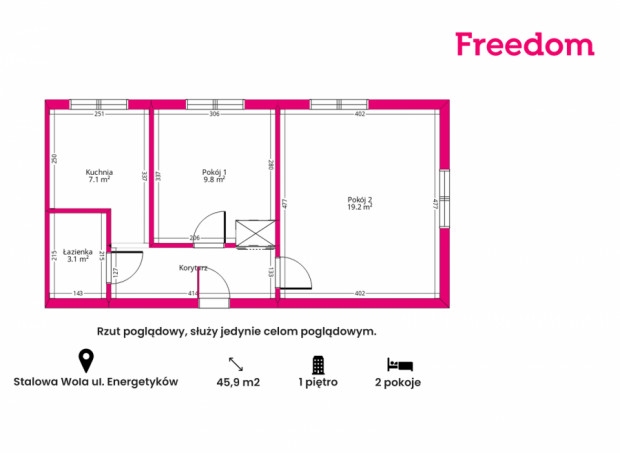 Oferujemy na wynajem przestronne i świeżo wyremontowane mieszkanie o powierzchni 45,9 m², umiejscowione na 1 piętrze w zadbanym budynku przy ul. Energetyków 23 w Stalowej Woli.