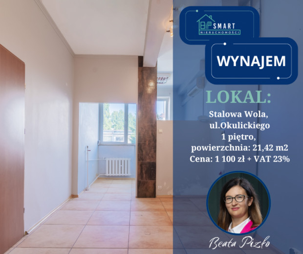 Biuro BiP Smart prezentuje ofertę wynajmu funkcjonalnego pomieszczenia o powierzchni 21,42 m², położonego przy ul. Okulickiego w Stalowej Woli. To idealna propozycja dla osób poszukujących małego, dobrze zlokalizowanego lokalu do prowadzenia działalności usługowej lub biurowej. Lokal znajduje się w ciągu innych lokali usługowych, co zapewnia duży ruch potencjalnych klientów.