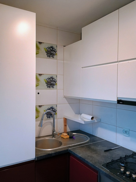 kuchnia z meblami na wymiar i sprzętem AGD w zabudowie (piekarnik, płyta gazowa, zmywarka – roczna)