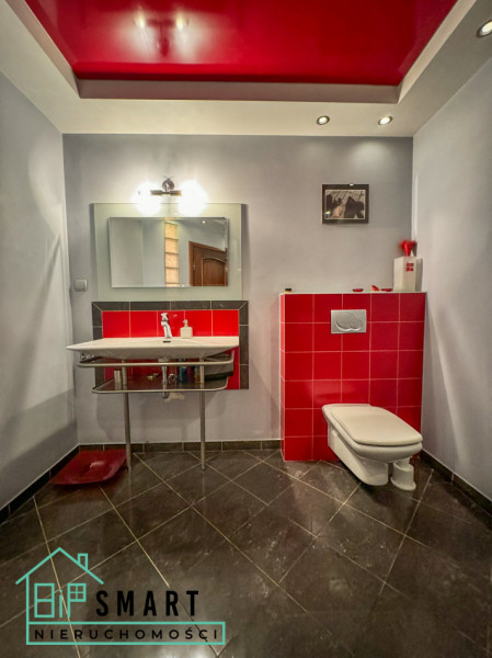 Łazienka z prysznicem na tym poziomie to kompletne przeciwieństwo bajkowej łazienki na parterze – nowoczesna, w odważnej czerwono-szarej kolorystyce, z designerskim sufitem napinanym w kolorze bordowym, który nadaje wnętrzu dramatyczny, elegancki charakter. Kabina prysznicowa z intensywnie czerwonymi płytkami to śmiały akcent, który podkreśla współczesny styl całego pomieszczenia.