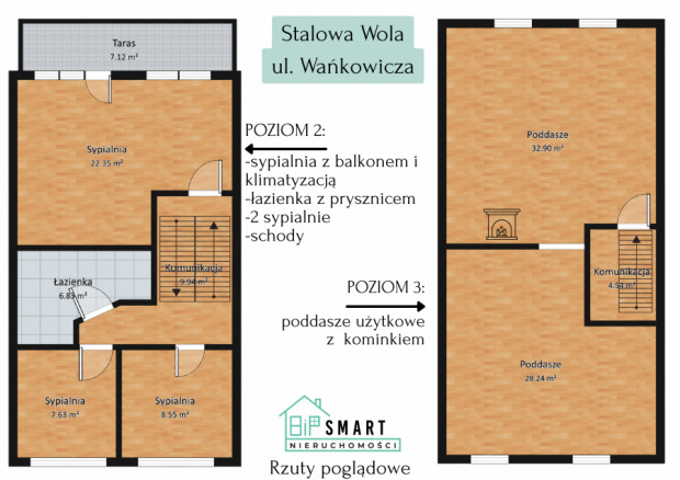 Kominki: 2 (typu koza – w salonie i na poddaszu)